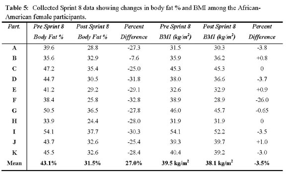 decrease in body fat % when comparing pre-Sprint 8 trial